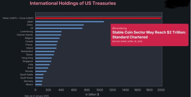 US Treasury Secretary Scott Bessent believes a $2 trillion market cap for stablecoins is a reasonable estimate. That would make stablecoin companies the world’s largest holder of US treasuries.