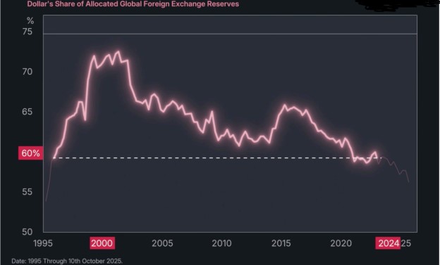 Between 2000 and 2024, the US dollar represented at the very least 60% of globalreserves.This strong